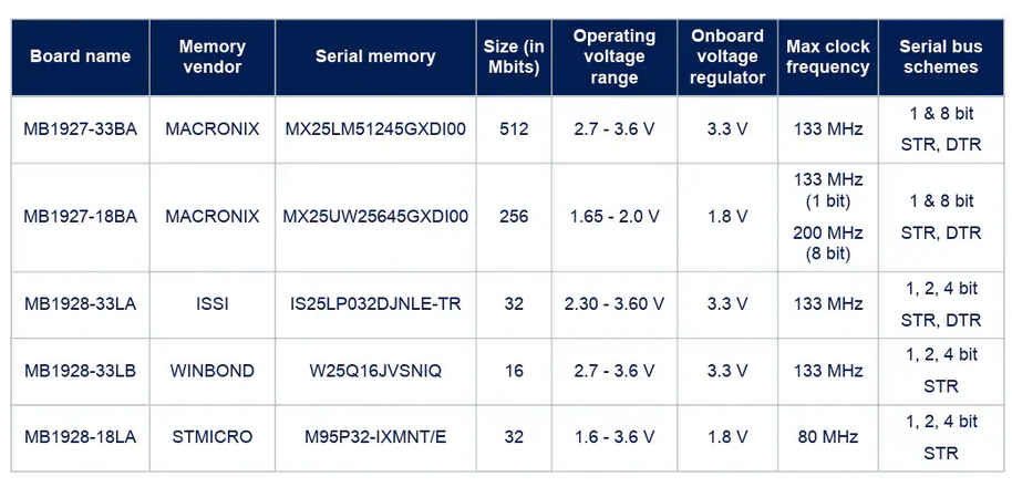 Mit dem B-M2MEM-PACK1 steht nun ein preisgünstiges Kit zur Verfügung, das fünf – teilweise von Fremdherstellern stammende – Speichemodule schlüsselfertig einbindet. Die in der Abbildung gezeigte Tabelle informiert über die SKUs.