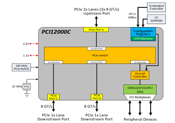 Wo ein PCIe-Switch ist, ist Bedarf nach zusätzlichen Steuersignalen oft nicht fern. Microchip begegnet diesem Begehr mit dem in der Abbildung gezeigten Kombinationsperipheriegerät.
