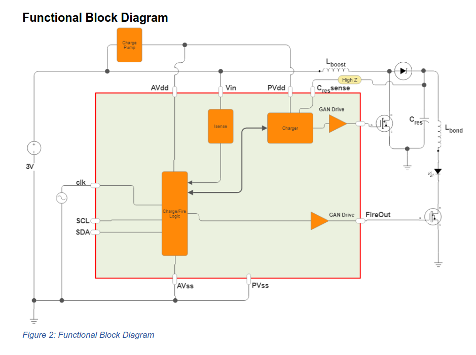 Das Bereitstellen der für Laser-Pulse benötigten Energie erfolgt seit jeher durch Kondensatorbänke und Schaltregler. Im Hause Silanna lanciert man neuartige integrierte Schaltkreise, die diese Aufgaben – wie in der Abbildung gezeigt – in einem Gehäuse unterbringen.